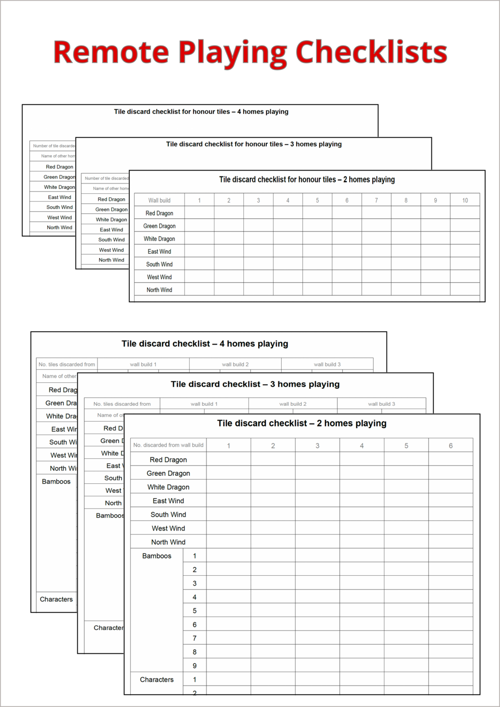 Download these checklists to help you play Mah-Jong remotely. They help you keep tabs on the tiles discarded by players in the other homes.